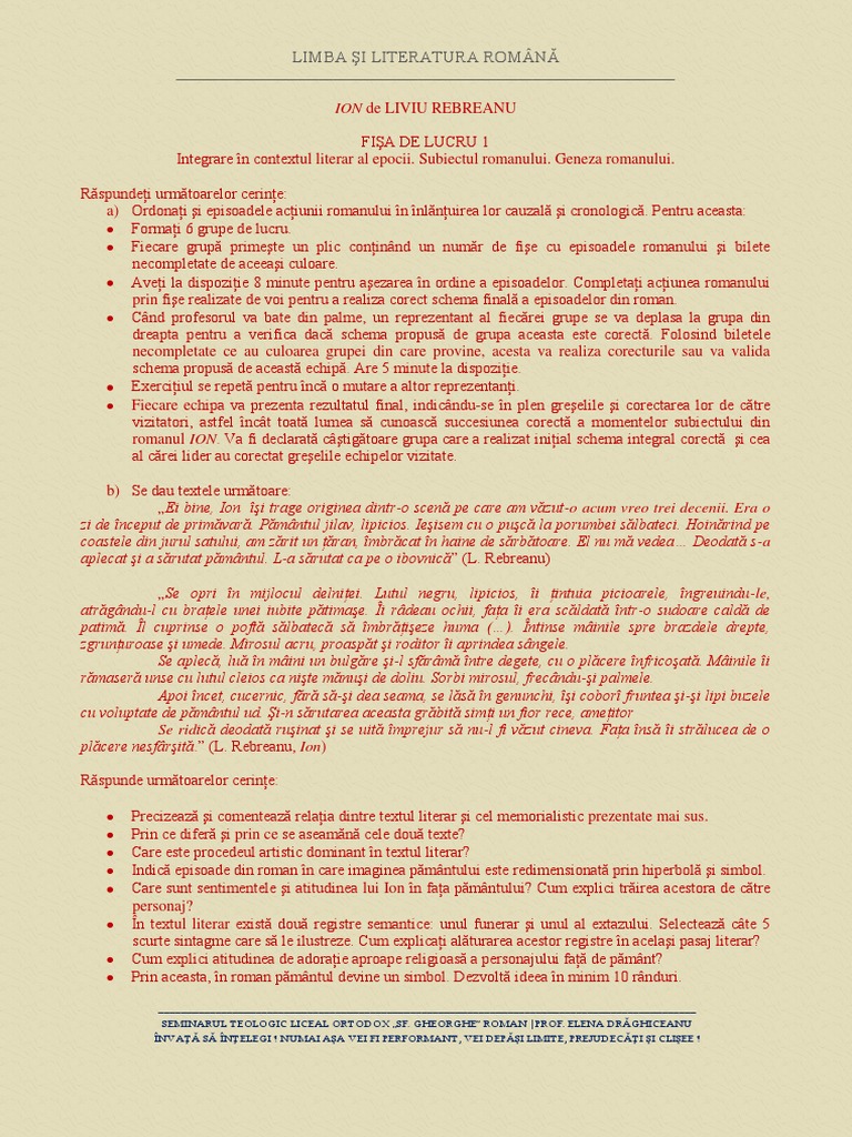 Fisa Cl10 8 Ion De L Rebreanu Fisa De Lucru