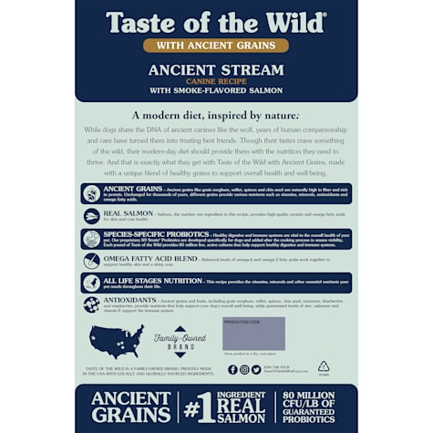 Ingredient review we ll begin this review of taste of the wild ancient grains ancient stream canine recipe with smoked salmon with a detailed discussion of the ingredients. As a group the brand features an average protein content of 33 and a mean fat level of 18. Now featuring recipes crafted with ancient grains taste of the wild offers pet parents even more tasty options to choose from. As a group the brand features an average protein content of 32 and a mean fat level of 18.